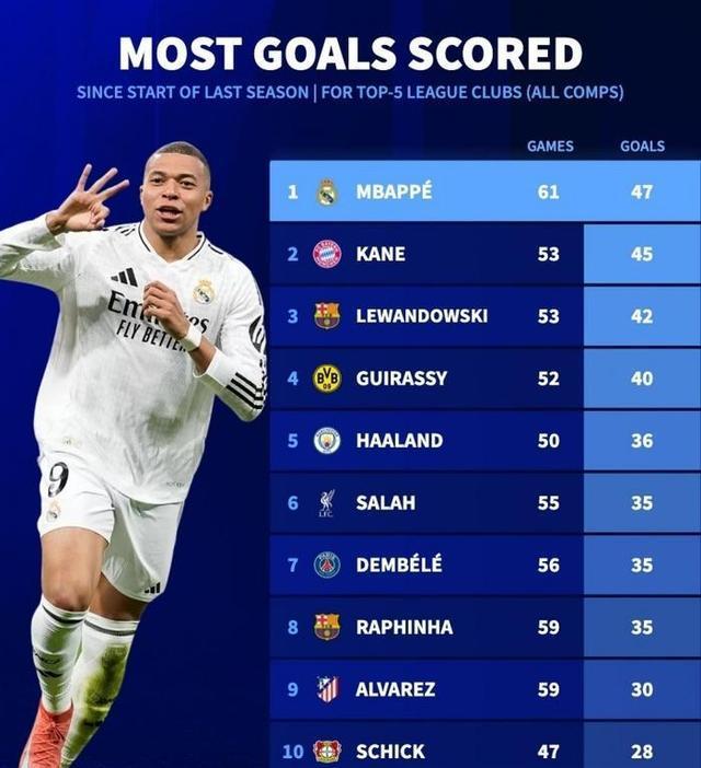 可没想到的是,他们居然遭遇到了赛季大退步,各项赛事没有一个奖杯进账的情况,让姆巴佩格外伤心,也被外界球迷予以了巨大的批评。毕竟在他来之前他们是冠军的,在他来之后却什么都没有了,似乎问题都积攒到了姆巴佩个人的身上。可是姆巴佩的进球效率,又很是不错,从上赛季加入到皇马,到本赛季他已经完成了47粒进球。这个数据横扫欧陆其他选手,哪怕是发挥极其出色的哈里-·凯恩,也比他少了2粒进球的。